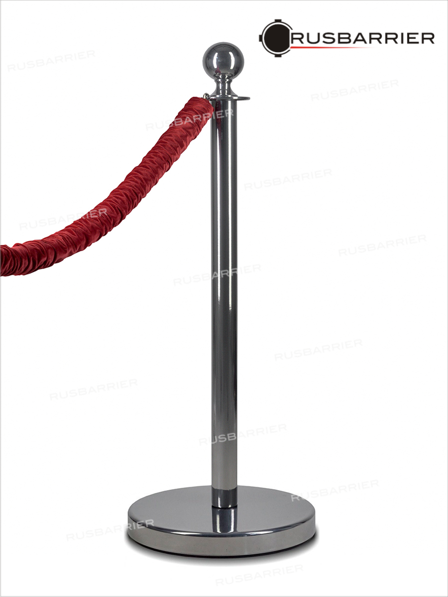 Ограждающая стальная стойка с шаром с полимерным покрытием под хром. Блестящая поверхность корпуса и декоративный шар на вершине придают стойке солидный вид. Используется в зонах с повышенным вниманием к визуальному оформлению ограждений: в гостиницах, банках, бизнес-центрах, на выставках и официальных мероприятиях.